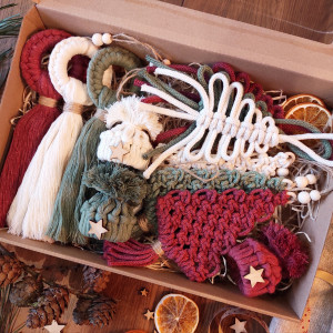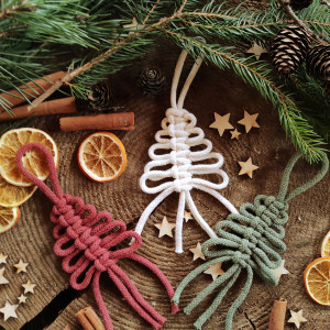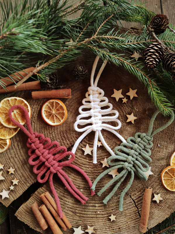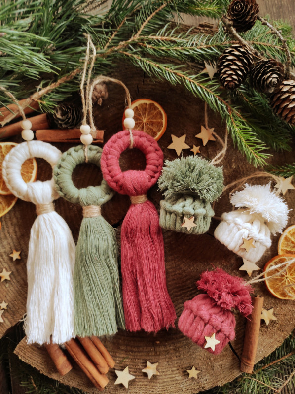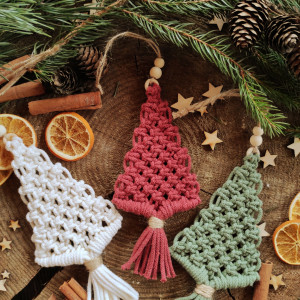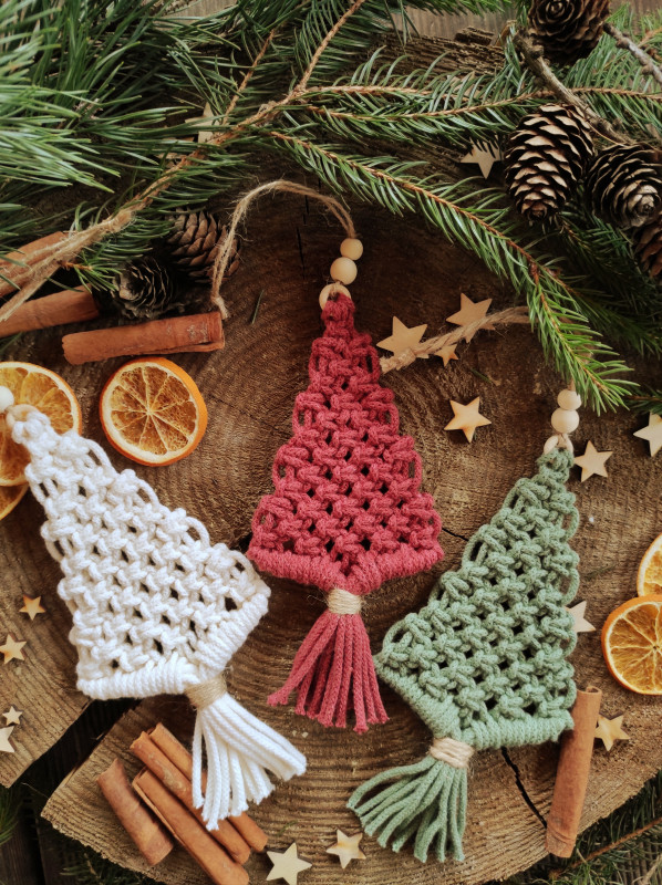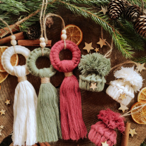 Świąteczne ozdoby wykonane techniką makramy że sznurka bawełnianego z dodatkiem drewnianych korali oraz sznurka jutowego to oryginalna dekoracja w stylu Boho pasująca do każdego wnętrza.
