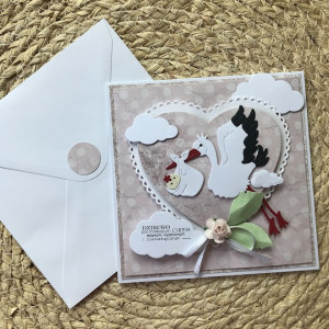 Kolorowa i wesoła kartka w komplecie z kopertą z okazji narodzin dziecka.