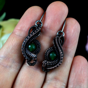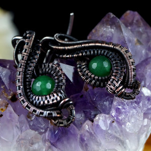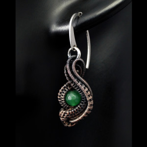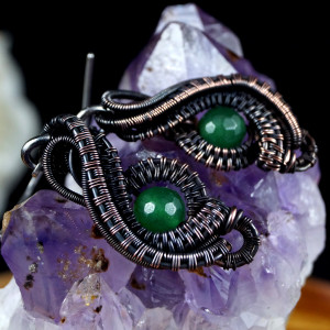 Miedziane, patynowane kolczyki z kuleczkami agatu zielonego. Całość wykonana przeze mnie od podstaw bardzo pracochłonną i precyzyjną techniką wire-wrapping. Biżuteria wykonana w całości z miedzi. Kolczyki idealne na co dzień oraz na wieczorne wyjście. Wymiary: Długość z biglami: 4.3 cm Szerokość: 1.3 cm Kolczyki zapakowane zostaną w ozdobne pudełeczko na biżuterię.