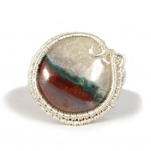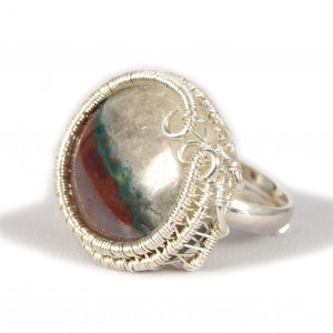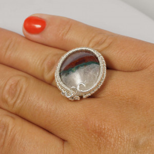 Misternie wykonany pierścionek z kaboszonem agatu czerwono biało zielonego Całość wykonana ręcznie ze srebra próby 925, 930 i 999. Pierścionek wykonany w bardzo pracochłonnej technice wire-wrapping. . Średnica obrączki wewnętrzna : 16 mm - 17.3 mm Rozmiar: 11 EU- 15 EU ( 6- 7 USA ) Grubość obrączki: 3 mm Wielkość kamienia: 19 x 19 mm Pierścionek zapakowany zostanie w ozdobne pudełeczko na biżuterię.