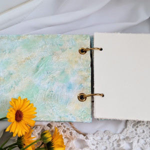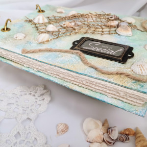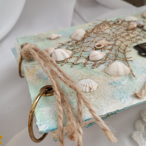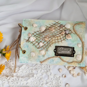 Okładka w kolorystyce oceanu, dekorowana naturalnymi muszelkami, złotą siatką, sznurem jutowym.