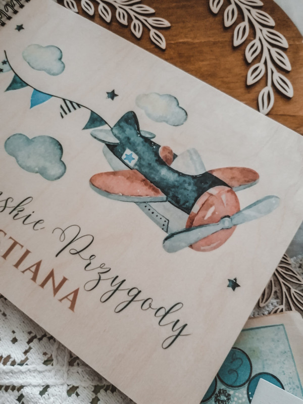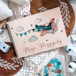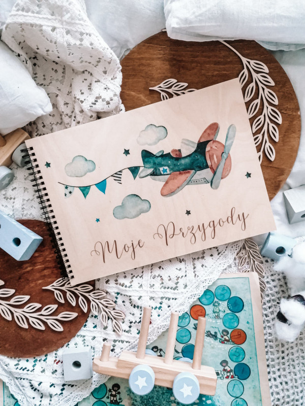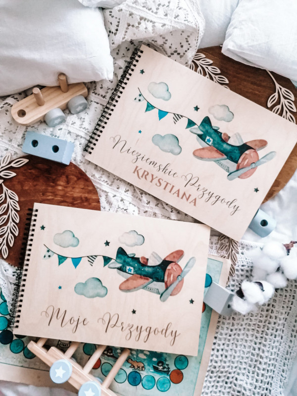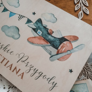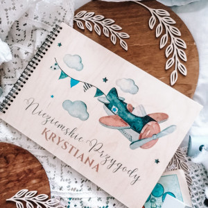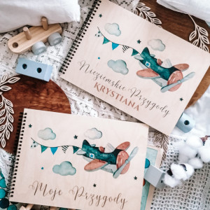 Album dla dziecka z motywem samolotu, utrzymanym w stylu watercolor. Piękne kolory granatu, niebieskiego i brązu. Album dla chłopca z okazji narodzin, chrztu, czy roczku - wzruszający prezent na całe życie.
