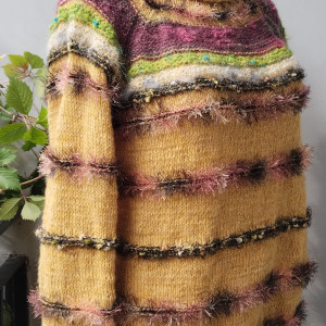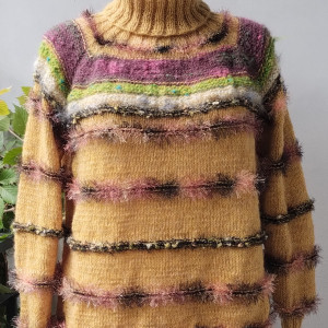 Sweterek zrobiony ręcznie z mieszanki alpaki i moheru że wstawkami z włóczki fantazyjnej. Delikatny, miękki, ciepły,miły w dotyku, nie podgryza. Doskonały na chłodne dni.