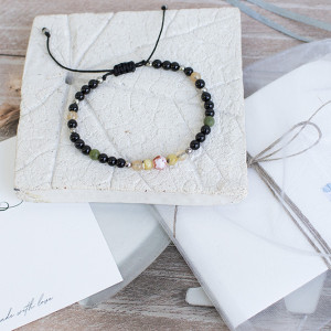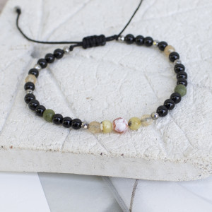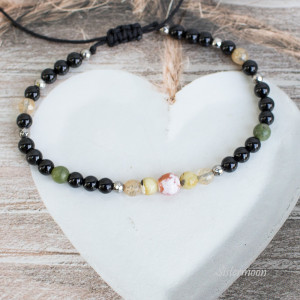 Amulet Bransoletka Ochronna wykonana ręcznie ze starannie wyselekcjonowanych minerałów o średnicy 3, 4 i 6 mm: czarny onyks, fasetowany granat, bursztyn, cytryn, hematyt, agat oraz mocnego, nieblaknącego i nieprzecierającego się sznurka z przesuwnym zapięciem makramowym.
