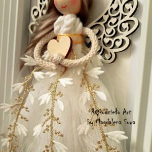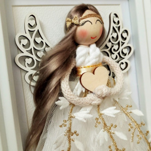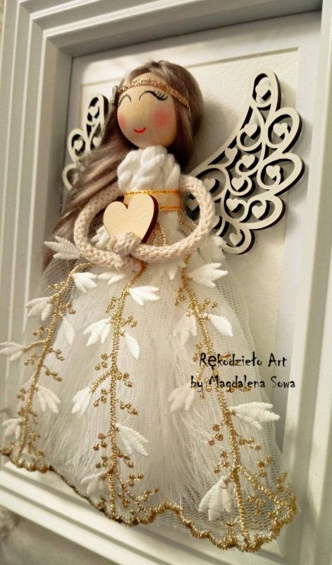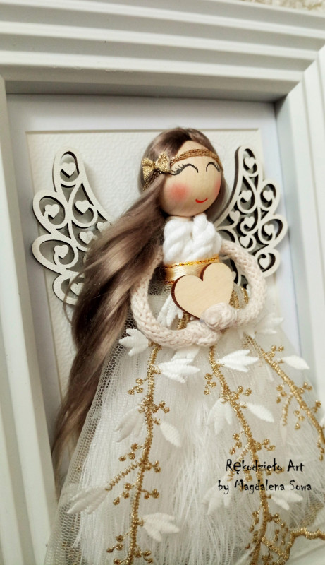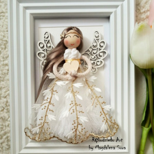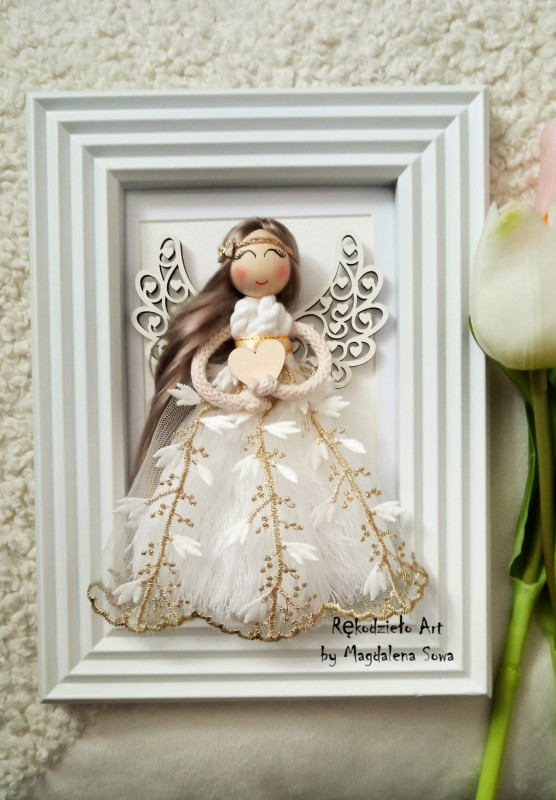 Aniołek wykonany w 100% ręcznie.Aniołek w ramce na wyjątkowy prezent, jako pamiątka Komunii Świętej i nie tylko..