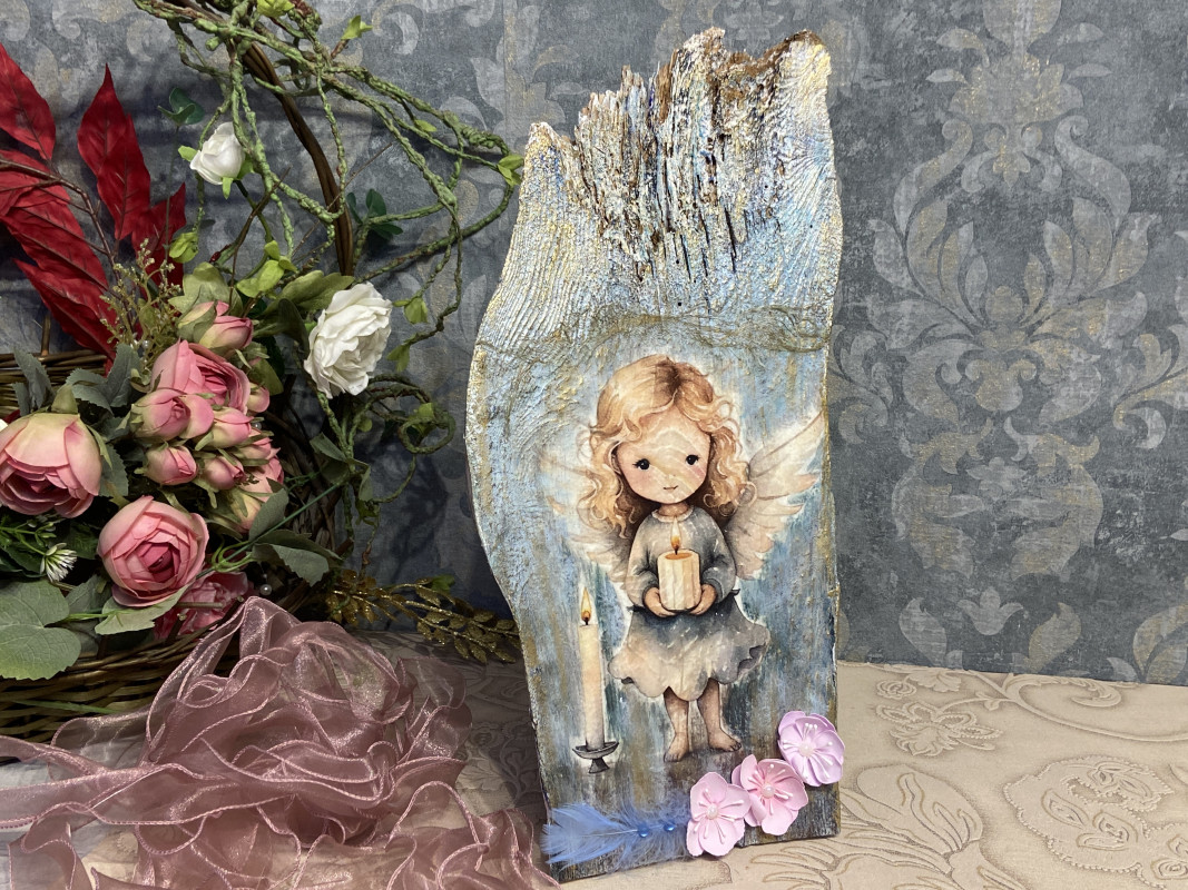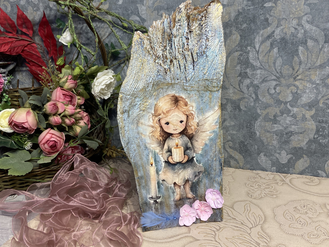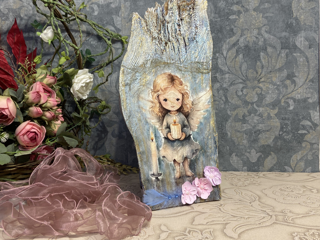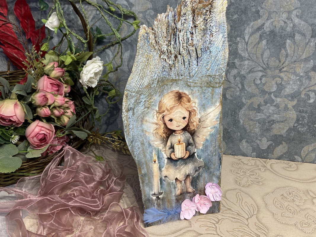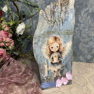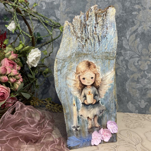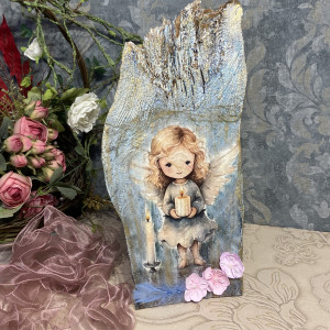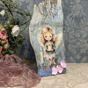 Ten subtelny i niepowtarzalny anioł został wykonany na desce odzyskanej ze starej stodoły, dzięki czemu każdy egzemplarz ma swój wyjątkowy charakter.