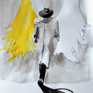 Praca akwarelą i piórkiem "Anioł w kapeluszu" wykonana przez artystkę plastyka Adrianę Laube na białym 300g papierze A3 (42cm x 30cm). Praca sygnowana, wysyłana w kartonowej tubie.