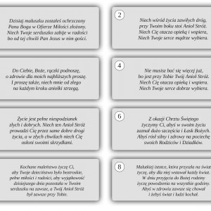 Proszę wybrać numer modlitwy do ramki spośród pokazanych na zdjęciu przykładów lub przesłać własny tekst modlitwy lub życzeń. Brak wyboru spowoduje, że modlitwa do ramki będzie wybrana losowo.