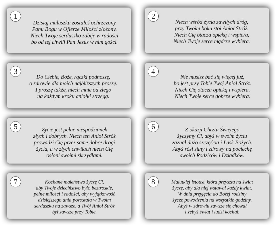 Proszę wybrać numer modlitwy do ramki spośród pokazanych na zdjęciu przykładów lub przesłać własny tekst modlitwy lub życzeń. Brak wyboru spowoduje, że modlitwa do ramki będzie wybrana losowo.