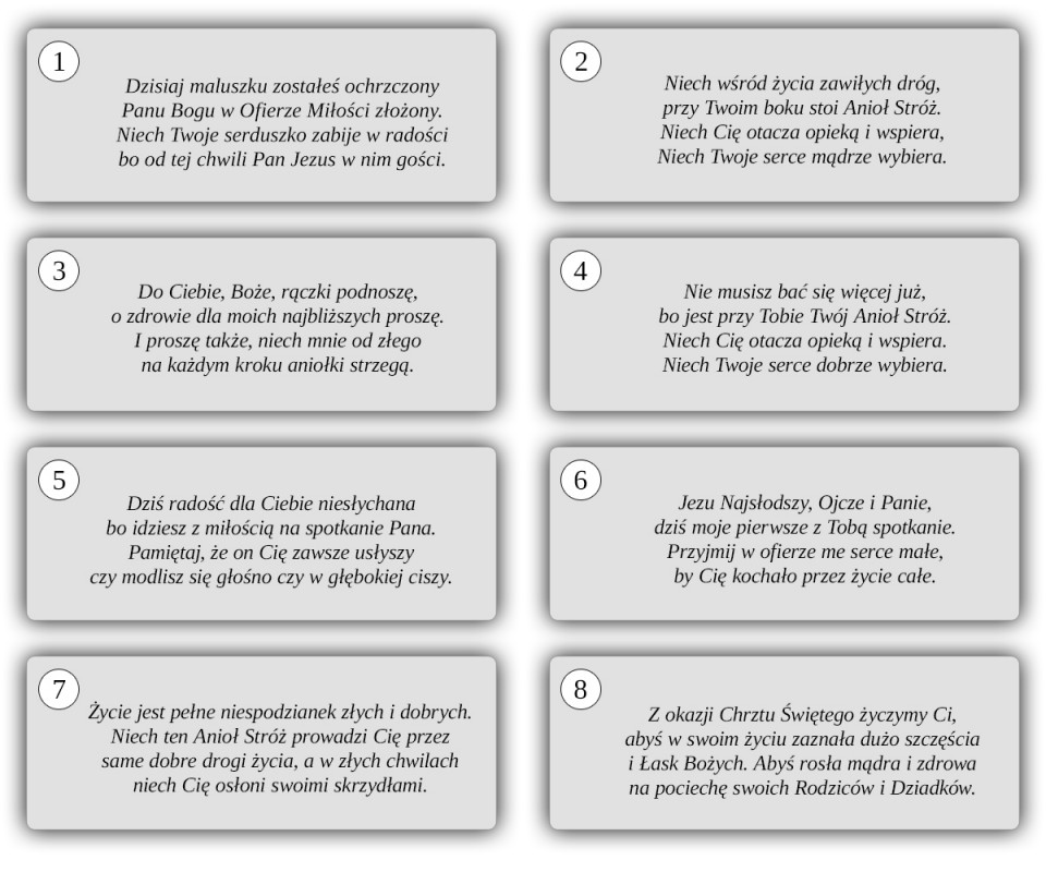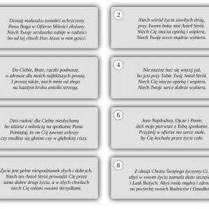 Proszę wybrać numer modlitwy do ramki spośród pokazanych na zdjęciu przykładów lub przesłać własny tekst modlitwy lub życzeń. Brak wyboru spowoduje, że modlitwa do ramki będzie wybrana losowo.