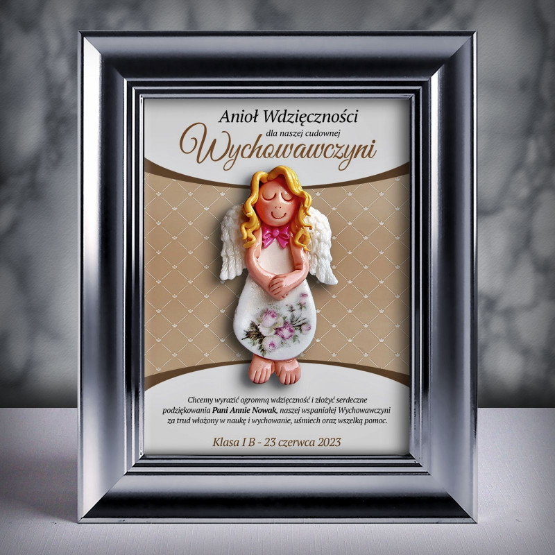 Pamiątka dla wychowawczyni z okazji zakończenia roku - ramka 15x20 srebrna 3D z aniołkiem