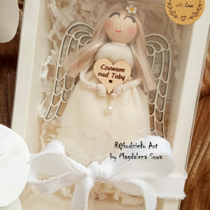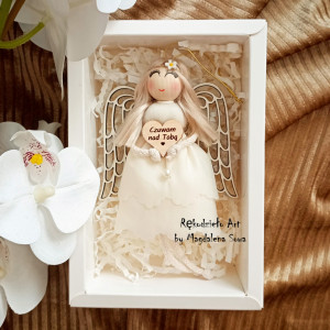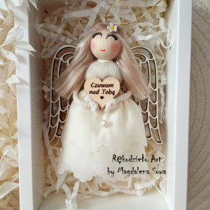 Aniołek zostanie zapakowany w kartonik z okienkiem, przewiązany wstążeczką, gotowy do wręczenia jako prezent - zdjęcia