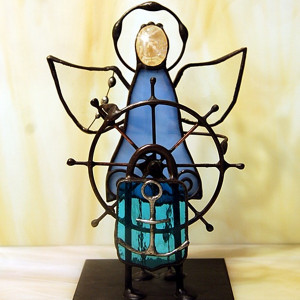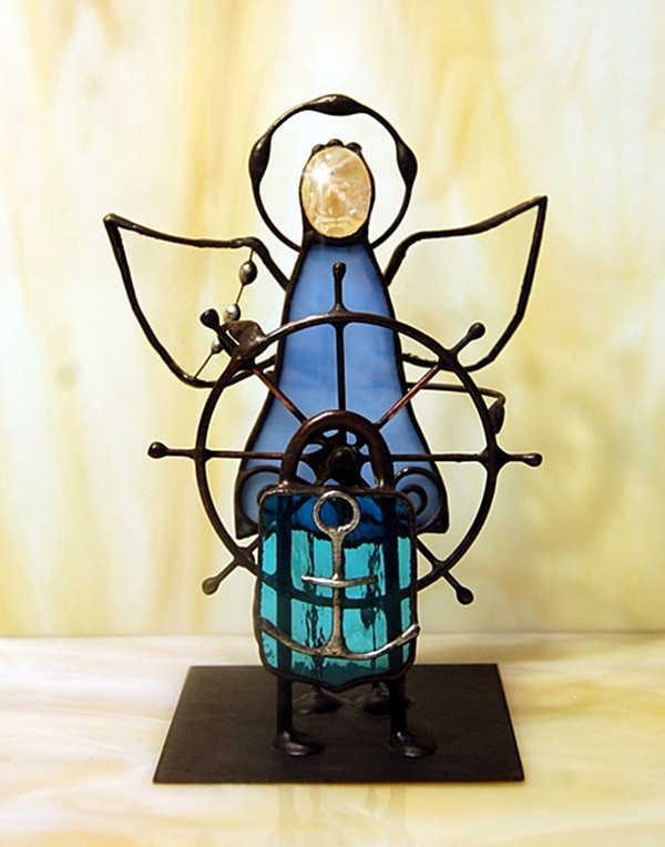 Aniołek witrażowy wykonany techniką Tiffany ze szkła spectrum. Inne materiały to miedź, mosiądz i cyna. Patynowany na czarno. Aniołek z serii zawodów lub hobby. Wysokość aniołka 13 cm, podstawka 6 x 6 cm. Możliwość zamówienia koloru.