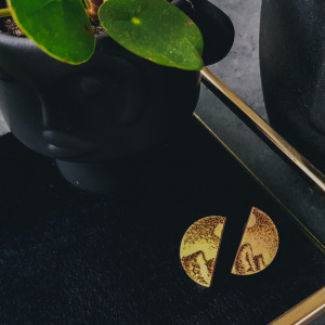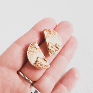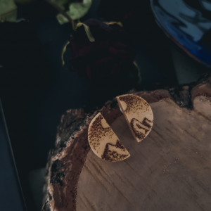 Małe kolczyki, które wykonałam z drewna. Kółka, które je zdobią są z naturalnego drewna, a na nich wypaliłam wzór inspirowany naturą: góry. Zabezpieczyłam je lakierem, żeby nie straciły swojego uroku.