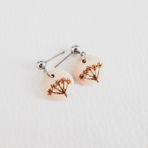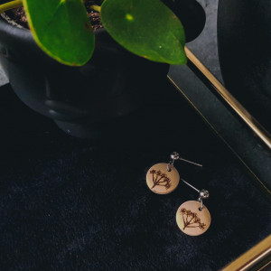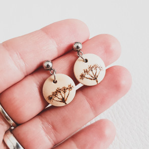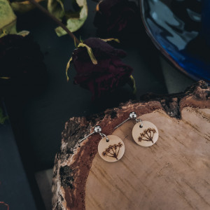 Małe kolczyki, które wykonałam z drewna. Kółka, które je zdobią są z naturalnego drewna, a na nich wypaliłam wzór inspirowany naturą: krwawnik. Zabezpieczyłam je lakierem, żeby nie straciły swojego uroku.