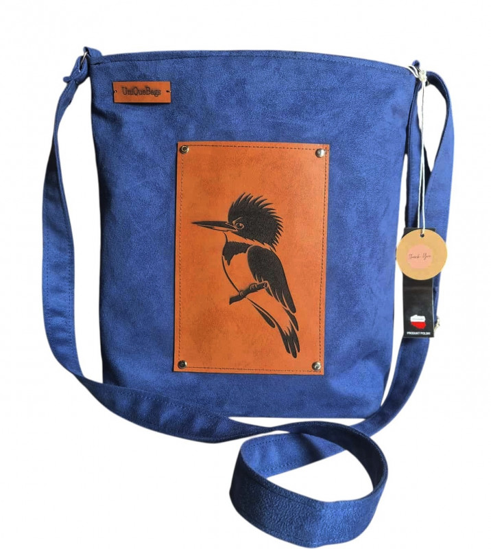 Front torby ozdobiony jest laserowo ciętym i grawerowanym wuzerunkiem zimorodka.