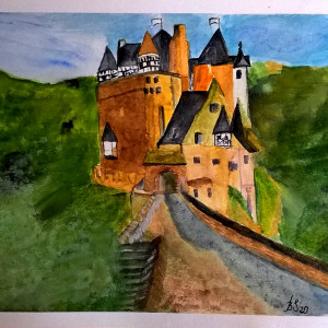 Bajkowy zamek Eltz w Niemczech. Akwarela Format A4
