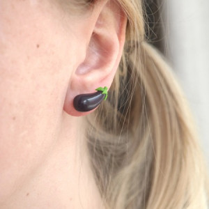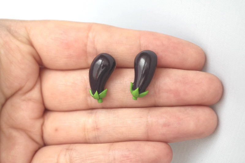 Ręcznie ulepione kolczyki w kształcie bakłażanów. Wykonane z wysokiej jakości modeliny Fimo i końcówek antyalergicznych (stal chirurgiczna). Pokryte profesjonalnym lakierem nabłyszczającym Fimo Gloss Varnish. Wymiary ok. 19mm x 9mm. Kolczyki są wykonane w 100% ręcznie i mogą minimalnie różnić się od przedstawionych na zdjęciu.