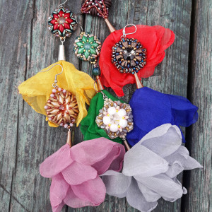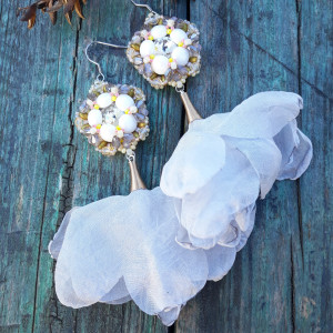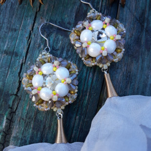 ,,baletnica w szarości,, to niezwykle kobiece, ażurowe kolczyki wykonane z kryształowej rivoli oplecionej szklanymi koralikami i kryształkami w różnych odcieniach szarość, bieli, złota i beżu. Całości kolczyka dopełnia chwost kwiatek w kolorze jasnoszarym. Kolczyki zawieszone są na klasycznych biglach wykonanych ze stali szlachetnej.