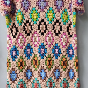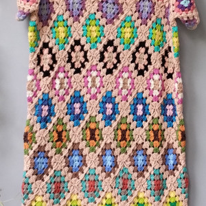 Sukienka zrobiona ręcznie z nitki w składzie 100%bawełna.Sukienka bezszwowa,zrobiona z kolorowych kwadratów. Dekolt w serek z przodu i z tyłu, krótki rękaw,doskonała na lato na imprezę,na prezent.