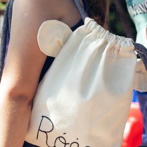 Dziecięcy plecaczek worek wykonany z surowej bawełny. Uszy misia. Ręcznie haftowane imię RÓŻA. Bawełniane sznurki w kolorze grafitowym.