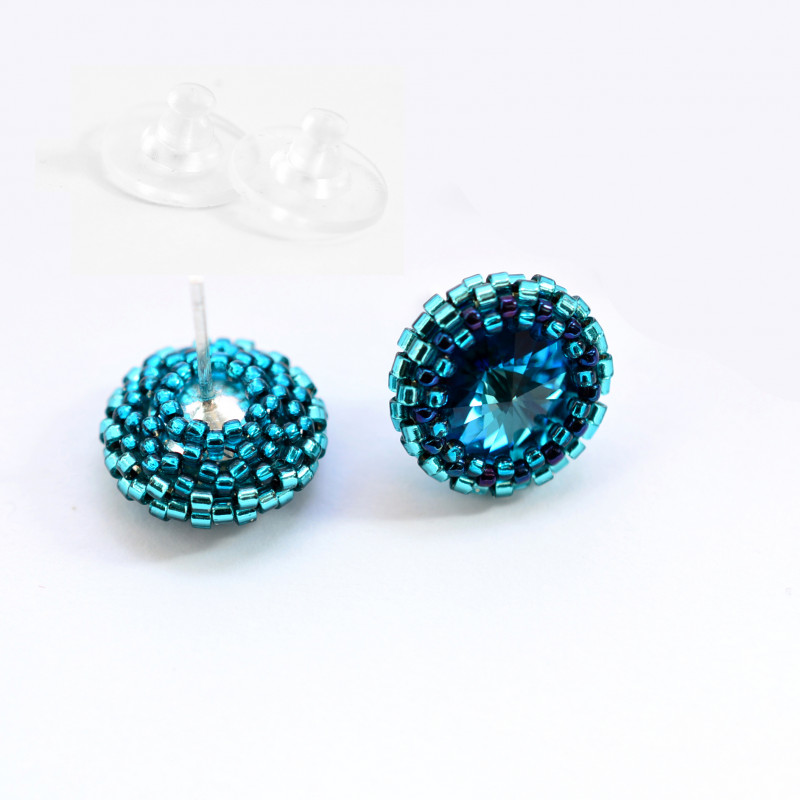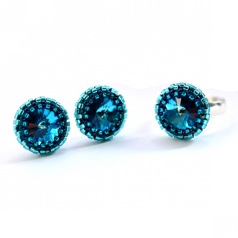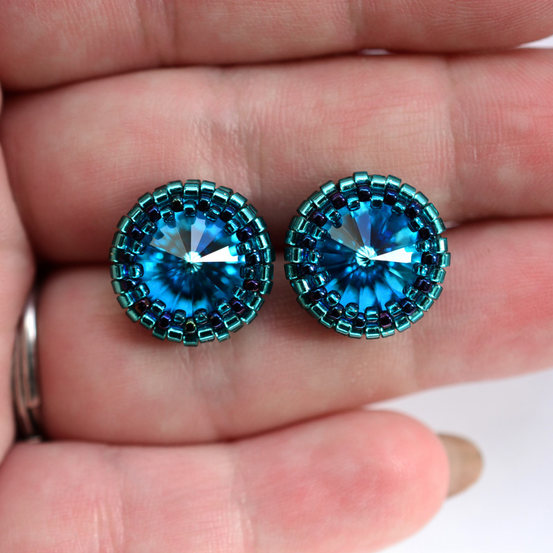 Ich serce stanowią kryształy rivoli Swarovskiego w kolorze bermuda blue, które oplotłam najwyższej jakości japońskimi koralikami Toho w odcieniach niebieskiego.