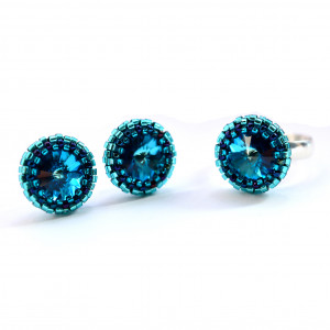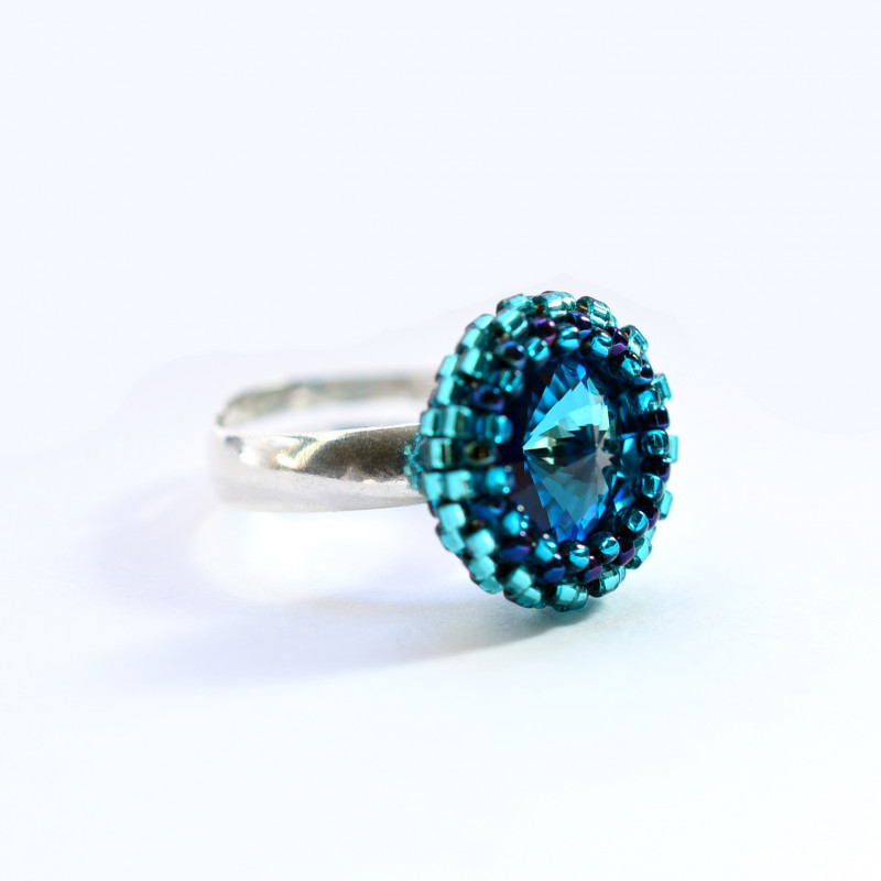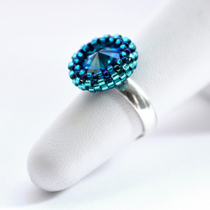 Oczko stanowi kryształ rivoli Swarovskiego w kolorze bermuda blue, który oplotłam najwyższej jakości japońskimi koralikami Toho w odcieniach niebieskiego.