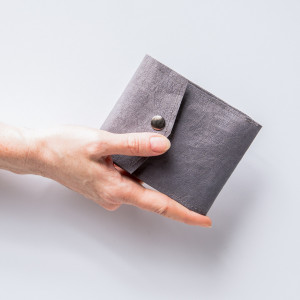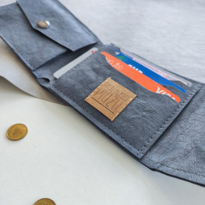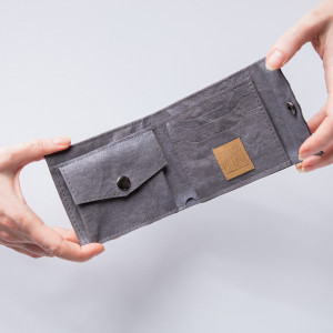 Portfel uszyty jest z ekologicznego materiału zwanego washpapa czyli innymi słowy impregnowanego papieru, który swoim wyglądem przypomina nieco skórę a dzieki impregnacji jest odporny na działanie wody. Washpapa jest w 100% wegańska.