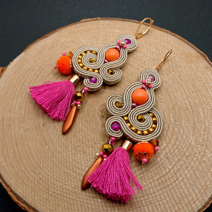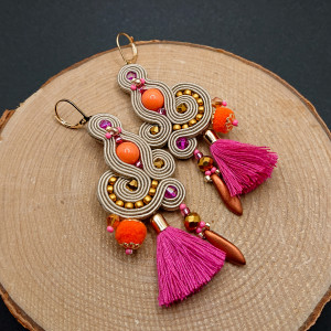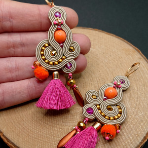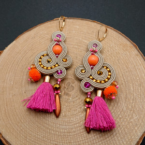 Kolczyki uszyte z beżowego sznurka wypełnionego szklanymi koralikami oraz drobnymi kryształkami w odciniach różu i pomarańczu. Dół kolczyków zdobią szklane koraliki o różnych kształtach, frędzle w złotej oprawie oraz pompony. Kolczyki zawieszone na biglach angielskich w kolorze złotym.