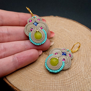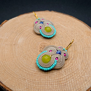Limonkowe szklane kulki otoczone sznurkami sutasz oraz szklanymi koralikami o rożnych kształtach i wielkościach. Kolczyki zawieszone na biglach angielskich w kolorze złotym.