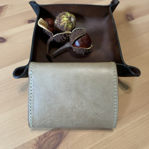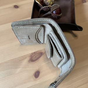 Portfel wykonany ze skóry bydlęcej garbowanej roślinnie.