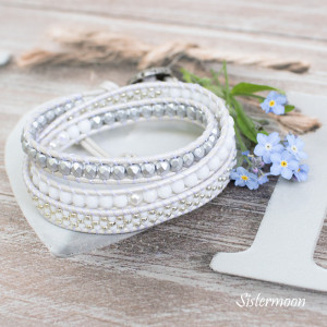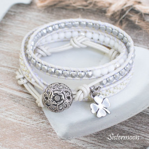 Biała bransoletka boho, bransoletka ślubna, owijana wokół nadgarstka, bransoleta w stylu Chan Luu, wykonana na bazie lakierowanego rzemienia w kolorze srebrna biel (polskiej produkcji, wysoka jakość). Szklane czeskie kryształki Fire Polish, japońskie koraliki Toho z nieścieralną powłoką, białe perełki Swarovskiego, zapinanie na oryginalny włoski metalowy guzik. W zawieszce czterolistna koniczynka ze stali chirurgicznej. Bransoletka do owinięcia 3x wokół nadgarstka. Pasuje na nadgarstek o obwodzie 15-17 cm (wielostopniowe zapinanie). Nadmiarowe końce rzemyka odciąć po dopasowaniu do nadgarstka.