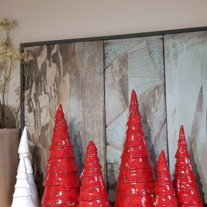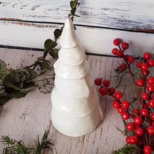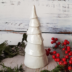 Figurka choinki ulepiona ręcznie z jasnej gliny, stworzona z wielu elementów, poszkliwiona w kolorze delikatnej, perłowej bieli.