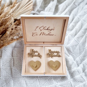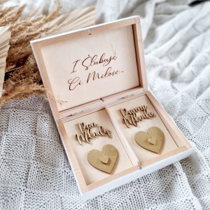 Wieko pudełka na obrączki zdobione jest delikatnym sercem a pod spodem widnieje napis "I Ślubuję Ci Miłość".