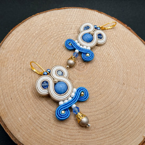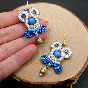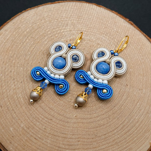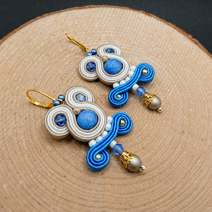 Niebieskie kulki jadeitu otoczone sznurkami sutasz w kolorze białym, beżowym i niebieskim oraz szklanymi japońskimi i czeskimi koralikami o różnych kształtach i kolorach. Dół kolczyków zdobią szklane kulki w ażurowych złotych czapeczkach. Kolczyki zawieszone na biglach angielskich w kolorze złotym.
