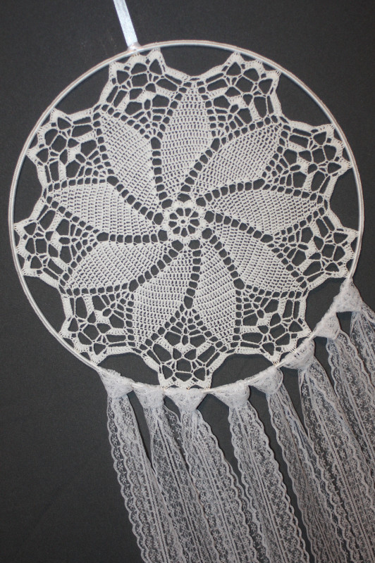 Duży koronkowy łapacz snów z koronkowymi wstążkami. Można go zawiesić na ścianie, lub na oknie. Idealny prezent na babyshower jako dekoracja do sypialni małej dziewczynki. Pomysł na prezent dla kobiety na Walentynki, urodziny, Boże Narodzenie, dla mamy na Dzień Matki.