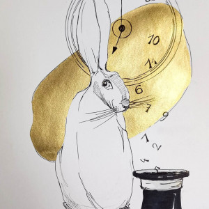 "Biały królik" praca wykonana piórkiem oraz złotym tuszem przez artystkę plastyka Adrianę Laube na białym 300g papierze A4 (29,7cm x 21cm). Praca sygnowana. Wysyłana w dobrze zabezpieczonej, kartonowej tubie, by dotarła do Państwa w idealnym stanie.