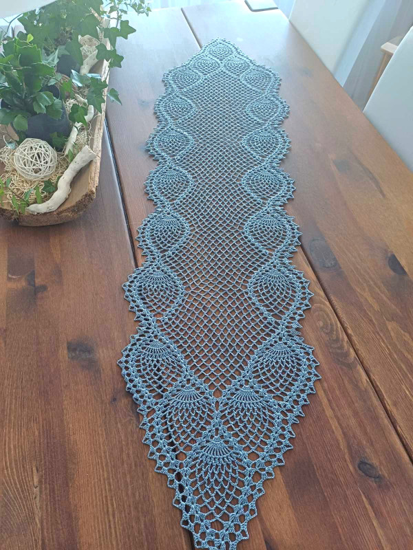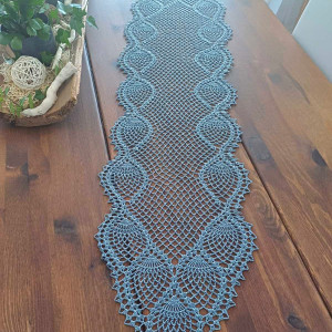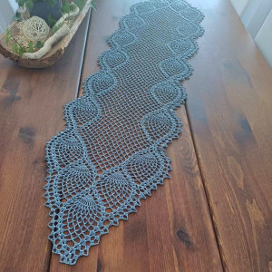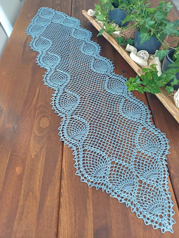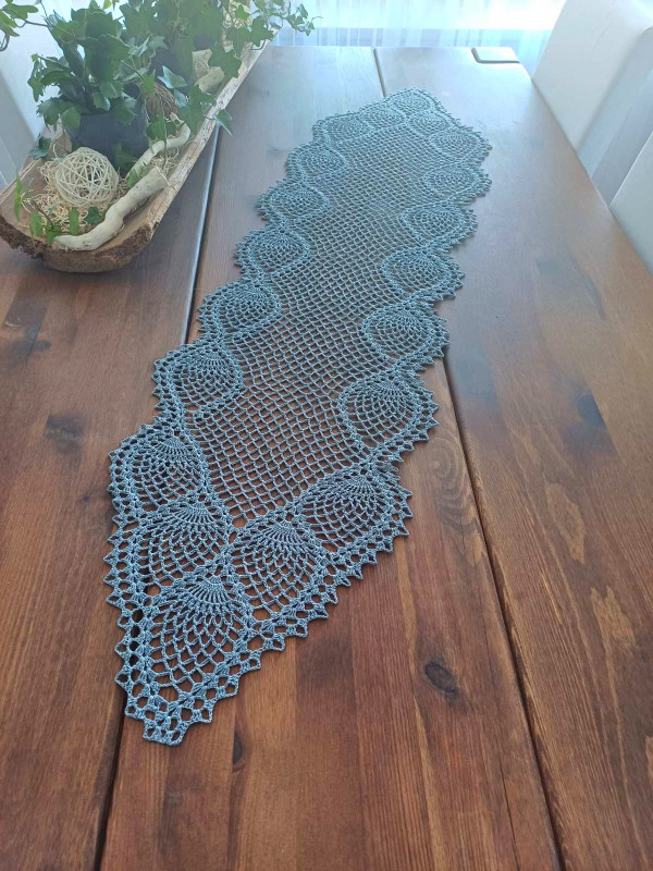 Bieżnik wykonany na szydełku z nici w kolorze popieli.