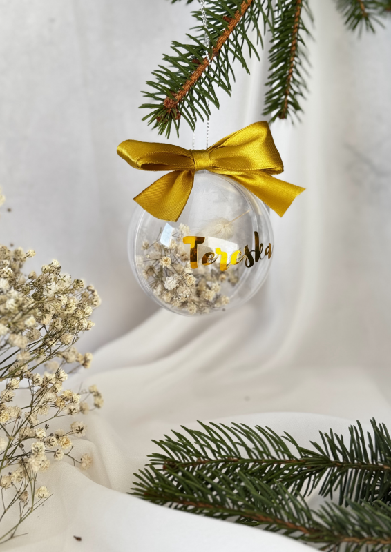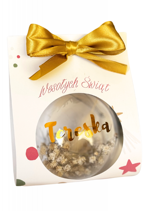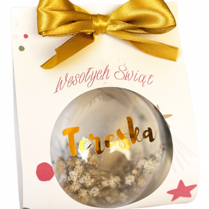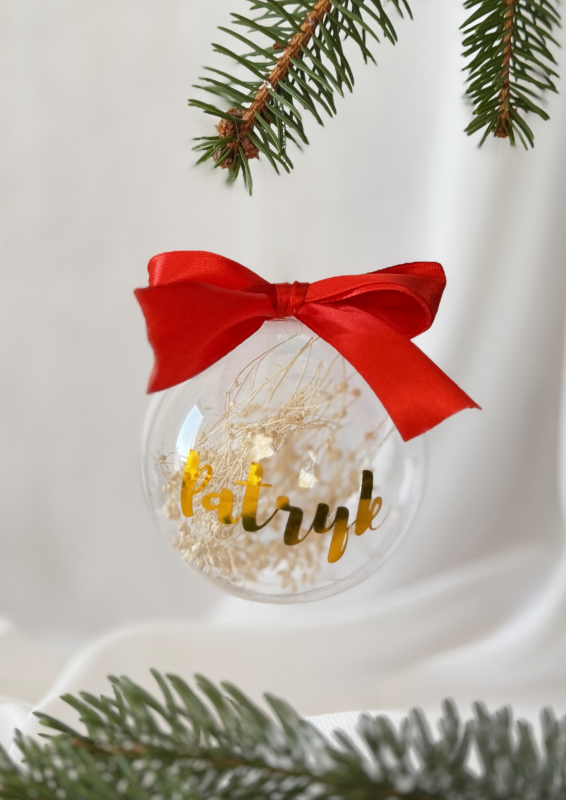 Ozdobna bombka z imieniem, suszonymi trawami i piękną kokardą.
