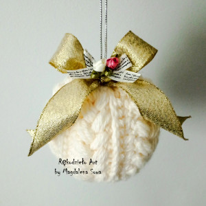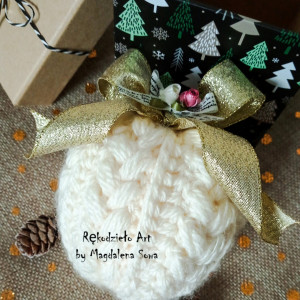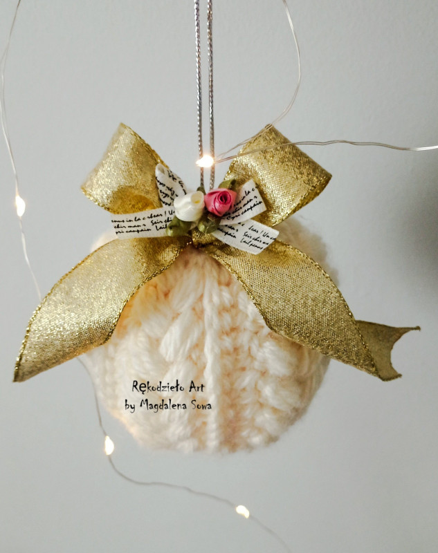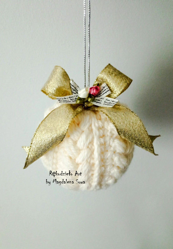 Śliczna bombka wykonana na styropianowej kuli o wielkości 8 cm z grubej wóczki (50% wełna, 50% akryl).