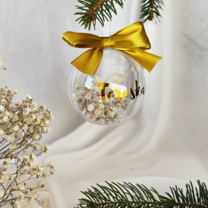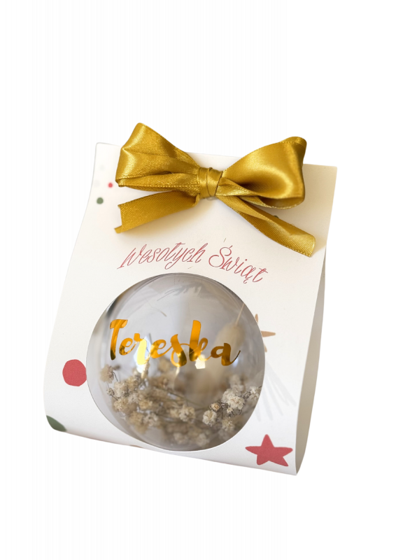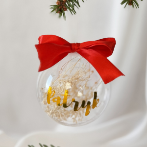 Ozdobna bombka z imieniem, suszonymi trawami i piękną kokardą.