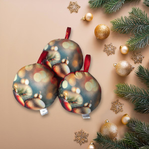 Mamy przyjemność przedstawić Państwu komplet trzech dużych wyjątkowych bombek, wypełnionych kulką silikonową. Nadruk przedstawia czerwone bombki na roziskrzonym beżowo - złotawym tle. Nasze bombki wykonane są z wysokiej jakości microfibry, która jest nie tylko miękka i przyjemna w dotyku, ale także bardzo trwała. Tył tej pracy to welur w kolorze czerwonym. Bombki są drukowane i szyte ręcznie w Polsce. Trzy zawieszki o wymiarach ok. 12 x 12 cm będą cieszyć jako dekoracja świąteczna, lub jako dodatek do prezentu pod choinkę. Żywe kolory dodadzą świątecznej atmosfery każdemu pomieszczeniu. Może być to zarówno ozdoba choinki jak i dekoracja ścienna w pokoju.