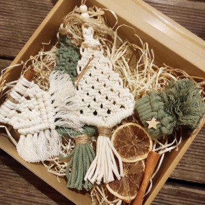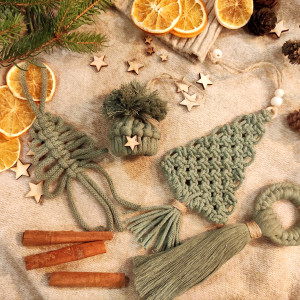 Świąteczne ozdoby wykonane techniką makramy że sznurka bawełnianego z dodatkiem drewnianych korali oraz sznurka jutowego to oryginalna dekoracja w stylu Boho pasująca do każdego wnętrza.