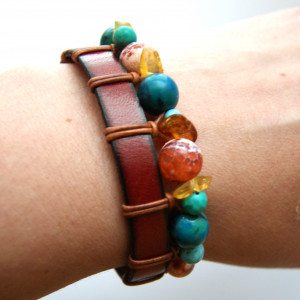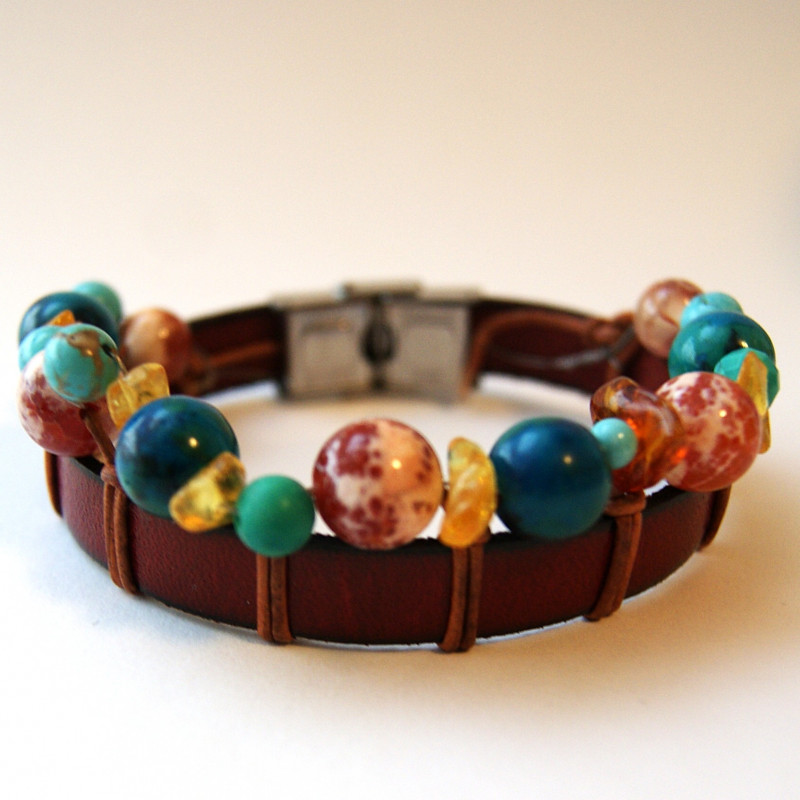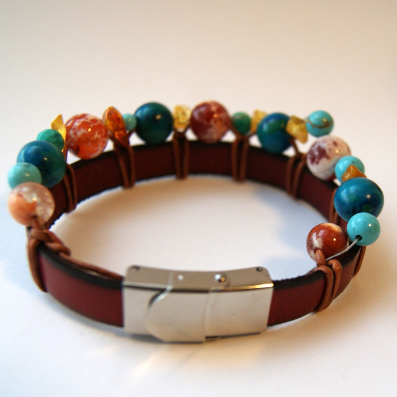 - Ręcznie wykonana, z naturalnych materiałów: kamienie: AGAT, CHRYZOKOLA, TURKUS, BURSZTYN i skórzany czerwony rzemień. Zapięcie - stal chirurgiczna.
