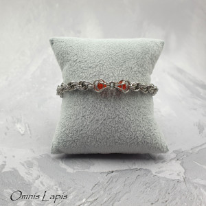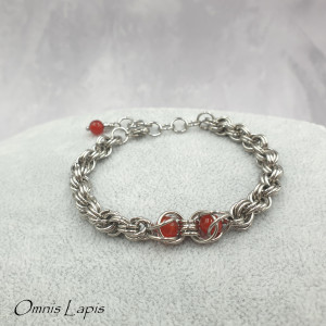 Oryginalna bransoletka damska wykonana w technice chainmaille, polegającej na łączeniu ze sobą metalowych ogniwek w określony wzór. Bransoletkę wykonałam ze 100% stali szlachetnej, ozdobiłam kulami naturalnego, fasetowanego agatu w kolorze ciemnopomarańczowym.