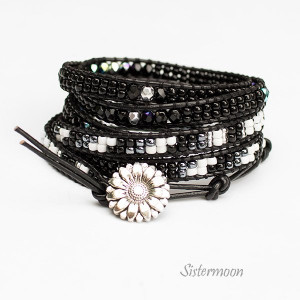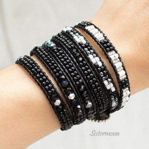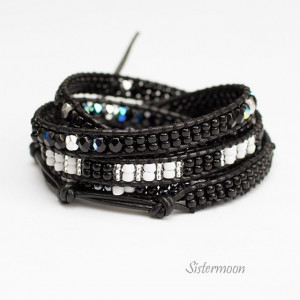 Czarno-biała bransoletka boho owijana wokół nadgarstka, wykonana na bazie lakierowanego rzemienia w czarnym kolorze. Tonacja: czerń, biel, grafit. Materiały wysokiej jakości. Rzemień polskiej produkcji. Szklane czeskie kryształki Fire Polish, japońskie koraliki Toho z nieścieralną powłoką, zapinanie na metalowy guzik. Szycie mocnymi nićmi podwójnie i solidnie. Bransoleta do owinięcia 5x wokół nadgarstka. Standardowy rozmiar pasuje na nadgarstek o obwodzie 15-17 cm (nadmiarowe końce rzemyka odciąć po dopasowaniu do nadgarstka), ale możliwy każdy inny rozmiar.