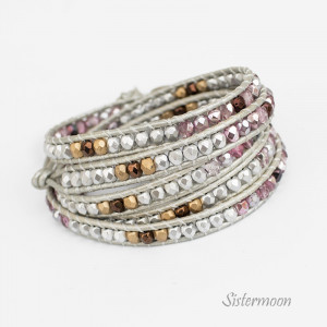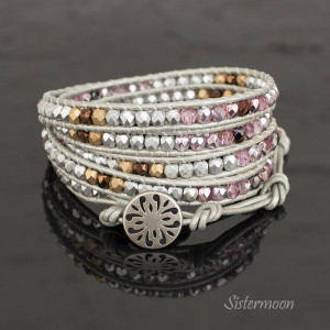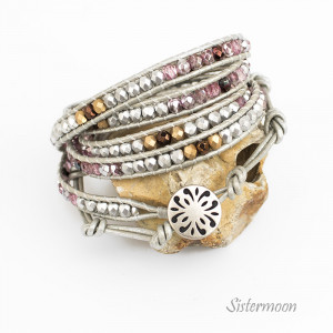Różowa bransoletka boho na bazie metalicznego srebrnego rzemyka. W stylu Chan Luu. Szklane kryształki Fire Polish w starannie dobranych barwach: mleczny matowy róż, srebrny fiolet, matowe srebro, matowe złoto, brąz, zapinanie na oryginalny metalowy guzik. Do owinięcia 5x wokół nadgarstka. Standardowy rozmiar pasuje na nadgarstek o obwodzie 15-18 cm (nadmiarowe końce rzemyka odciąć po dopasowaniu do nadgarstka), ale możliwy każdy inny rozmiar.