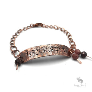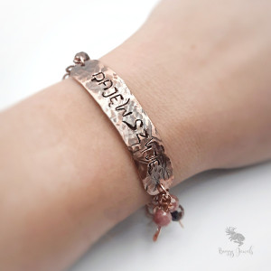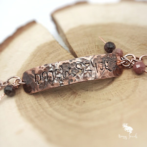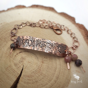 Bransoletka inspirowana wypowiedzią pewnego bardzo znanego polityka ;-) Wykonana całkowicie ręcznie z miedzi, która została poddana młotkowaniu, czernieniu i na końcu polerowaniu. Napis " Daję w szyję" wycinany ręcznie za pomocą piłki włosowej. Do bransoletki zostały doczepione koraliki z naturalnego rodonitu oraz łańcuszek do regulacji. Długość bransoletki 16-20 cm. W przypadku zainteresowania mogę dopasować odpowiedni rozmiar. Kilka słów o rodonicie: Jest to kamień, który swą nazwę zawdzięcza greckiemu słowu "rhodon" oznaczającego "różę" Nazwano go w ten sposób, za sprawą jego barwy, która najczęściej miewa różne odcienie różu. Ciekawostką jest to, że przypisuje się temu kamieniowi wpływ m.in. na łagodzenie przykrych doświadczeń i traum.. Mówi się również, że dzięki codziennemu noszeniu rodonitu przy sobie można odczuwać większe zadowolenie z życia.