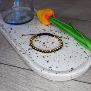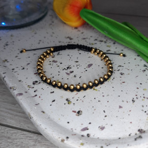 Bransoletka damska zrobiona ze sznurka poliestrowego w kolorze czarnym o średnicy 0,8 mm i koralików w kolorze złotym o średnicy 3 mm