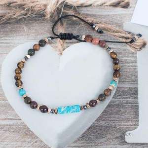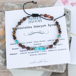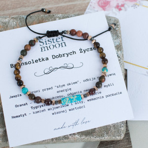 Bransoletka dobrych życzeń w kolorach ziemi. Damska bransoletka z minerałami – idealna na prezent. Pełna mocy i z ukrytym znaczeniem. Bransoletka wykonana ze starannie dobranych minerałów: jaspis picasso, jaspis imperial, tygrysie oko, hematyty w dwóch kolorach, minerały o średnicy 2, 3 i 4 mm.